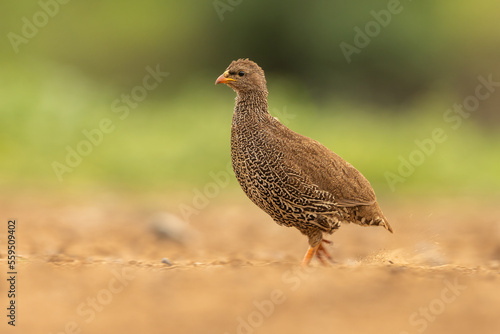 Natal francolin in a natural environment against a green background