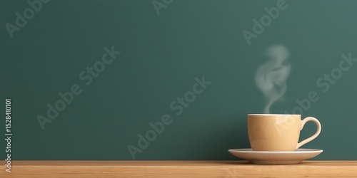 National cappuccino day with hot caffeine idea. Steaming cup of coffee on a wooden table against a green wall.