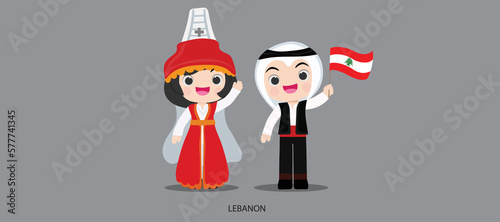 national dress with a flag. Man and woman in traditional costume. Travel to Lebanon. People. Vector flat illustration.