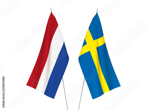 National fabric flags of Sweden and Netherlands isolated on white background. 3d rendering illustration.
