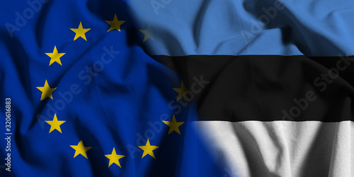 National flag of Estonia with European Union (EU) flag on a waving cotton texture background