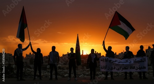 National flags raised in sunset silhouette by protesters