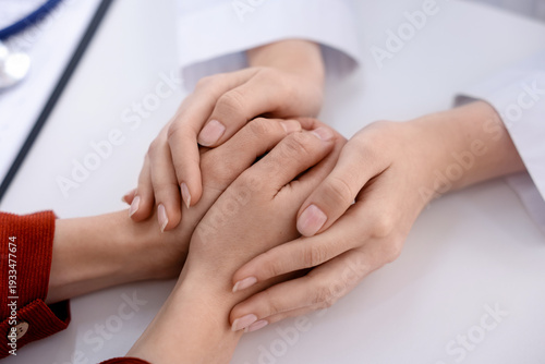 National health service (NHS). Doctor supporting her patient during appointment at white desk, closeup