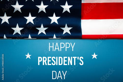National holidays of United States of America. Happy president's day with flag of the USA on blue background. Flat lay