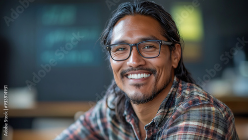 Native American Indigenous Man Teacher - man, smiling, glasses, plaid shirt, long hair, casual, indoors, portrait, happiness, young man, confident, friendly, cheerful, adult, male