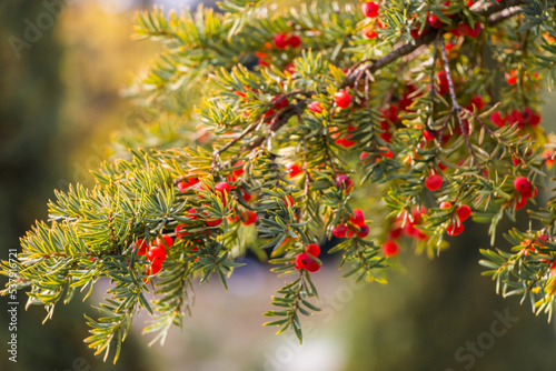 Natural autumn background. Green branches of a yew tree with red berries close-up on a bokeh background