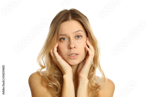 eye, woman, isolated, beauty, adult, face, white, young, human, hair, female, portrait, looking, beautiful, view, colours, image, studio, only, person, shoulder, 1, front, caucasian, blue, closeup, skin, background, model, attractive, shot, head, closeup, smile, well-being, sensuality, cosmetic, on, make-up, pretty, cute, girl, laughing, blond, carefree, european, fashion, perfection