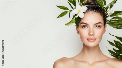 woman, beauty, natural, flower, green, leaf, white, floral, serene, pure, vitality, skincare, beauty product, cosmetic, spa, relaxation, wellness, healthy, fresh, glowing, skincare, make-up, model, portrait, gentle, gaze, graceful, elegant, femininity, nature, soft, delicate, aethereal, enchanting, alluring