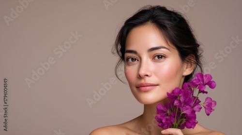 Natural beauty portrait of a woman holding purple flowers against a soft neutral background showcasing flawless skin and serene expression for wellness projects