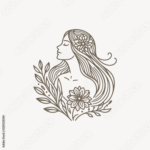 Natural beauty woman long hair vintage logo for salon or cosmetic product with line art style. Line art floral women logo design. creative vintage editable vector illustration. beautiful girl icon