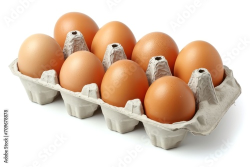 Natural eggs in cardboard package on white background. Generative AI