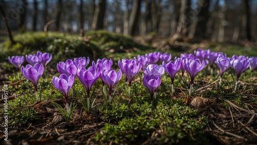 Natural forest scene with blooming wild purple crocus flowers in springtime.