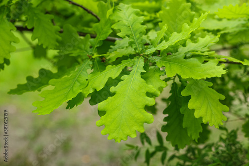 Natural green background. Oak branch with young green leaves.