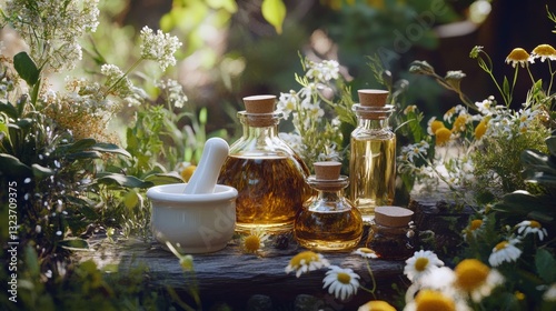 natural, herbal, oil, mortar, wildflower, garden, bottle, aroma, essence, plant, greenery, remedy, apothecary, blossom, chamomile, sunlight, relaxation, rustic, fragrant, organic, meadow, wellness, healing, environment, outdoors, therapeutic, calmness, botany, flora, traditional, vitality, peace, foliage, craftsmanship, health, lifestyle, extract, sustainability, rejuvenation, serenity, fresh, purity, vibrant, holistic