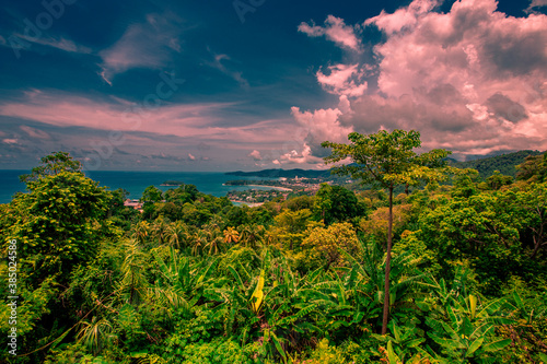 Natural high angle panoramic background With an atmosphere surrounded by mountains and trees, with a blurred wind, cool