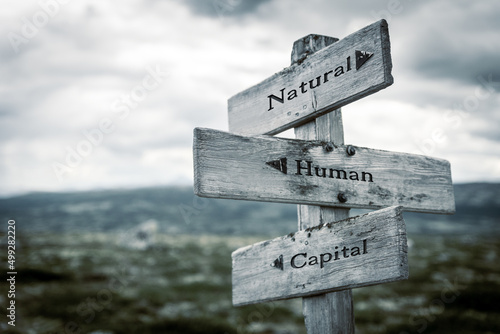 natural human capital text quote written in wooden signpost outdoors in nature. Moody theme feeling.