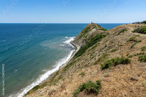 cape, bulgarian, black sea, coast, nature, pasture, landscape, hill, summer, day, sun, sky, field, season, distance, space, country, rural, rocky, background, lighthouse, building, rock, cliff