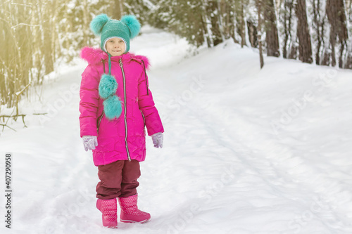 natural light. a girl in a red jacket and a green hat is surrounded by a lot of snow. He looks at us. Soft focus.