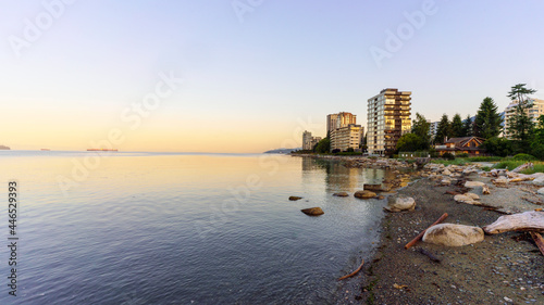 Natural, log and boulder-strewn West Vancouver beach at daybreak with container ships on horizon