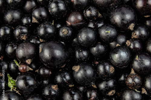 Natural organic black currant background with variety of ripe berries gathered in extreme macro closeup.