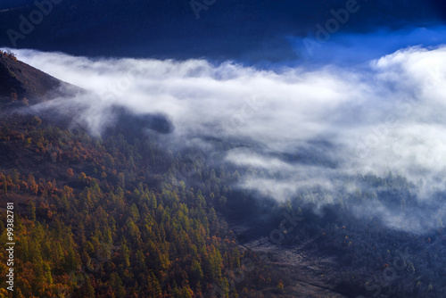 fog, vale, forest, mountain, travel, local landmark, tree, natural phenomenon, scenic, environment, mountain chain, outdoors, day, autumn, yellow, plant, wood, season, landscape, nature, tour tourism, tourist resort, tranquil scene, travel destination, vacation, journey, calmness, ground, china, east asia, asia, photo, color image, nobody, no people, aerial view, horizontal