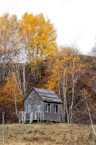 asia, china, tour tourism, traveler, autumn, lake, river, water, house, old, farm, landscape, rural, sky, wood, building, grass, country, home, fall, field, tree, wooden, nature, tree, rustic, village, cabin, shed, bungalow