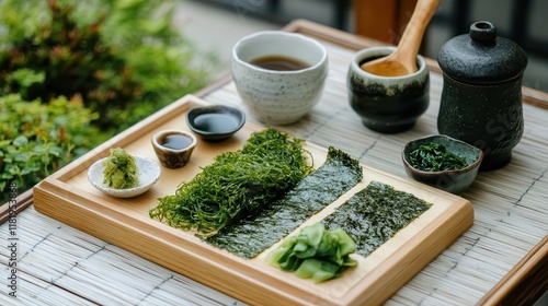Natural seaweed and sushi ingredients neatly presented for Japanese cuisine branding