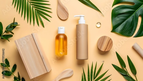 skincare, natural, product, leaf, orange, background, view, cosmetic, beauty, organic, wellness, spa, health, bottle, container, wooden, spoon, tropical, monstera, palm, green, beige, minimalist, clean, eco, friendly, arrangement, flat, lay, top, essential, oil, cream, lotion, serum, with