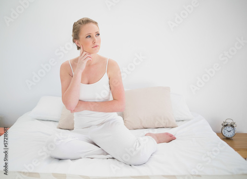 20s, young adult, woman, female, caucasian, indoor, looking up, bedchamber, bed, pillow, cushion, duvet, comforter, fair hair, blond, light hair, attractive, beautiful, cute, natural, pretty, casual attire, nightwear, pajama, white, sitting, leisure, lifestyle, serious, stern, unsmiling, frowning, thoughtful, thinking, daydreaming
