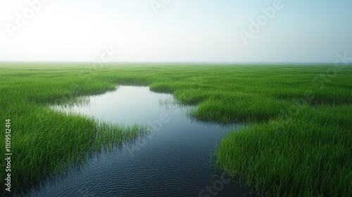 natural transpiration in environment concepts. Serene wetland landscape with vibrant green grass and a calm waterway under a misty sky.
