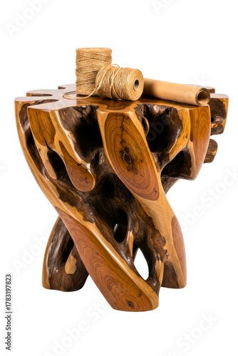 Natural wood root table with twine and craft paper on top isolated on transparent background