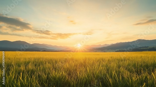 field, sky, landscape, sunset, grass, meadow, nature, wheat, summer, sun, green, agriculture, farm, sunrise, cloud, rural, yellow, cloud, countryside, blue, country, grain, horizon, beautiful, sunlight