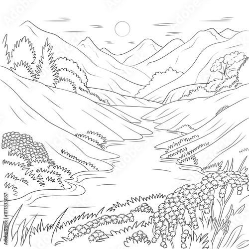 vector, illustration, tree, landscape, drawing, vignetting, art, forest, christmas, vintage, nature, winter, design, snow, grunge, texture, river, pattern, engraving, colouring, graphic, page, black, line, book, contour, doodle, ink, ornament, outline, vignetting, abstract, element, sun, white, adult, cactus, cute, floral, hand, sky, background