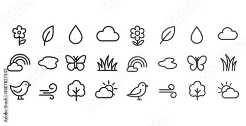 nature, icon, collection, flower, cloud, symbol, leaf, raindrop, rainbow, butterfly, grass, bird, wind, tree, sun, weather, outline, minimalist, design, vector, black, white, drawing, line, art, simple, pattern, element, set, natural, floral, environment, sky, abstract, foliage, climate, spring, leaf, season, illustration, minimal, flat, decoration, environmentally friendly, graphic