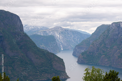 Nature view of Norwegian mountains from stegastein viewpoint on a cloudy summer day. Blue uv radiation on the mountains.