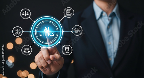 Navigating AI Ethics A visionary touch on the future of responsible technology set against a bokeh background and soft