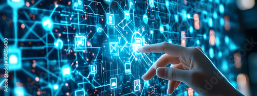 holographic, display, digital, icon, human, hand, blue, and, white, glow, transformation, technology, control, advanced, system, network, interactive, high technology, generative, ai, light, business, computer, water, energy, concept, space, design, cyberspace, communication, background, pattern, loop, network, three-dimensional, science, power, globe, illustration, nature