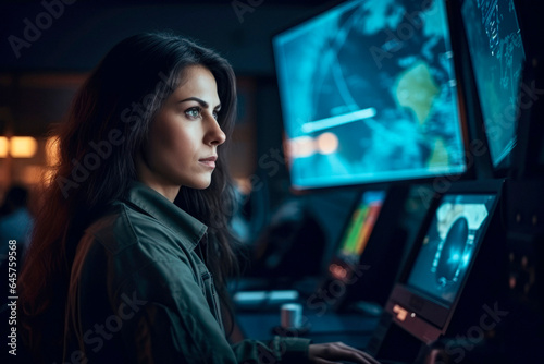 Navigating the Cosmos: Capturing the Expertise of a Female Space Engineer in the Dim Light, Surrounded by Glowing Screens.