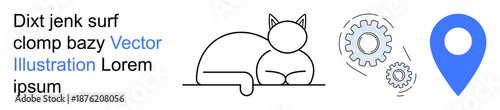 Navigation, systems, technology, location services, minimalism, pet . Cat outline, gear icons and a blue location pin on white. Navigation and systems concept
