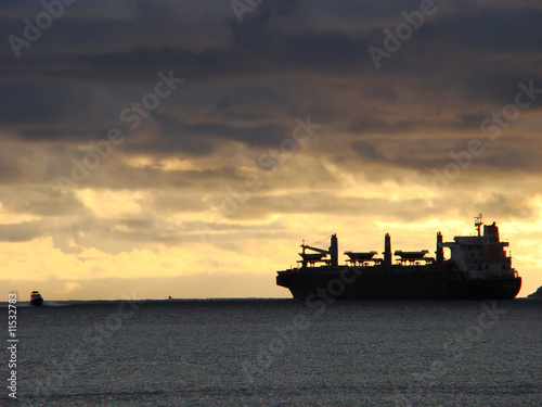 evening, boat, freighter, sea, ocean, shadow, horizon, silhouette, gold, clouded