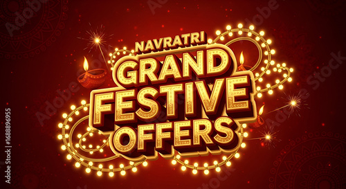 Navratri diwali festival sale shopping logo with Grand Festive offers 3d typography and retro lights decoration.