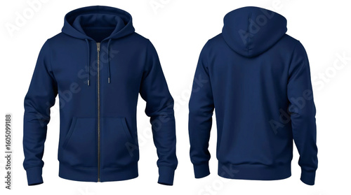 Navy blue hoodie with zipper in front and back view, mockup isolated on transparent background