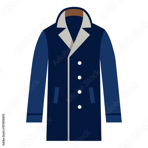 Navy coat with contrasting lapels illustration, Vector illustration of a stylish navy coat featuring light gray lapels, button closure, front pockets, and long sleeves, designed in a modern and sophis