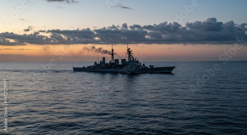 ship, sailing, military, ocean, sea, cloud, sunset, horizon, evening, calm, serene, coastal, maritime, navigation