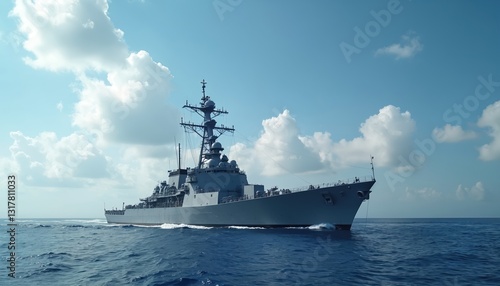 Navy ship sailing in blue sea under cloudy sky. Warship on mission patrol maritime borders. Naval forces demonstrating power, readiness. Perfect for military, defense, security themes.