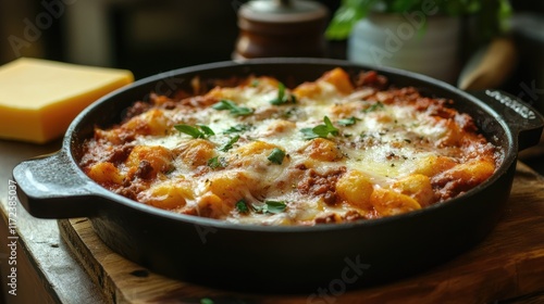 Neapolitan Gnocchi Baked with Traditional Ragu and Melted Cheese in Cast Iron Dish