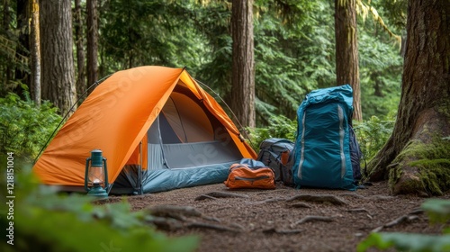 camping, gear, tent, sleeping-bag, lantern, forest, clearing, clean, minimalist, equipment, setup, adventure, preparation, natural, organised