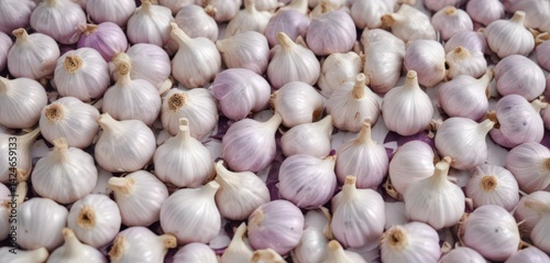 Neatly arranged fresh garlic bulbs, vibrant purple hues, white background, alliums, vegetable, ingredient