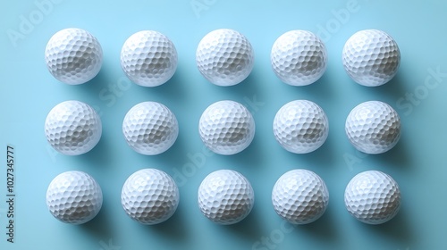 Neatly arranged golf balls in a light blue background, showcasing a symmetrical layout of white dimpled spheres in a clean and simple sports equipment composition.