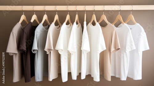Neatly arranged monochrome t-shirts on a wooden rack display a gradient of colors from dark to light, emphasizing simplicity and organized style.